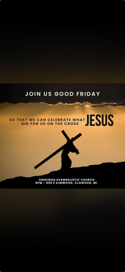 SHEKINAH EVANGELISTIC CHURCH 600 E ELMWOOD CLAWSON, MI JOIN US GOOD FRIDAY 6PM -7PM FRIDAY APRIL 3RD